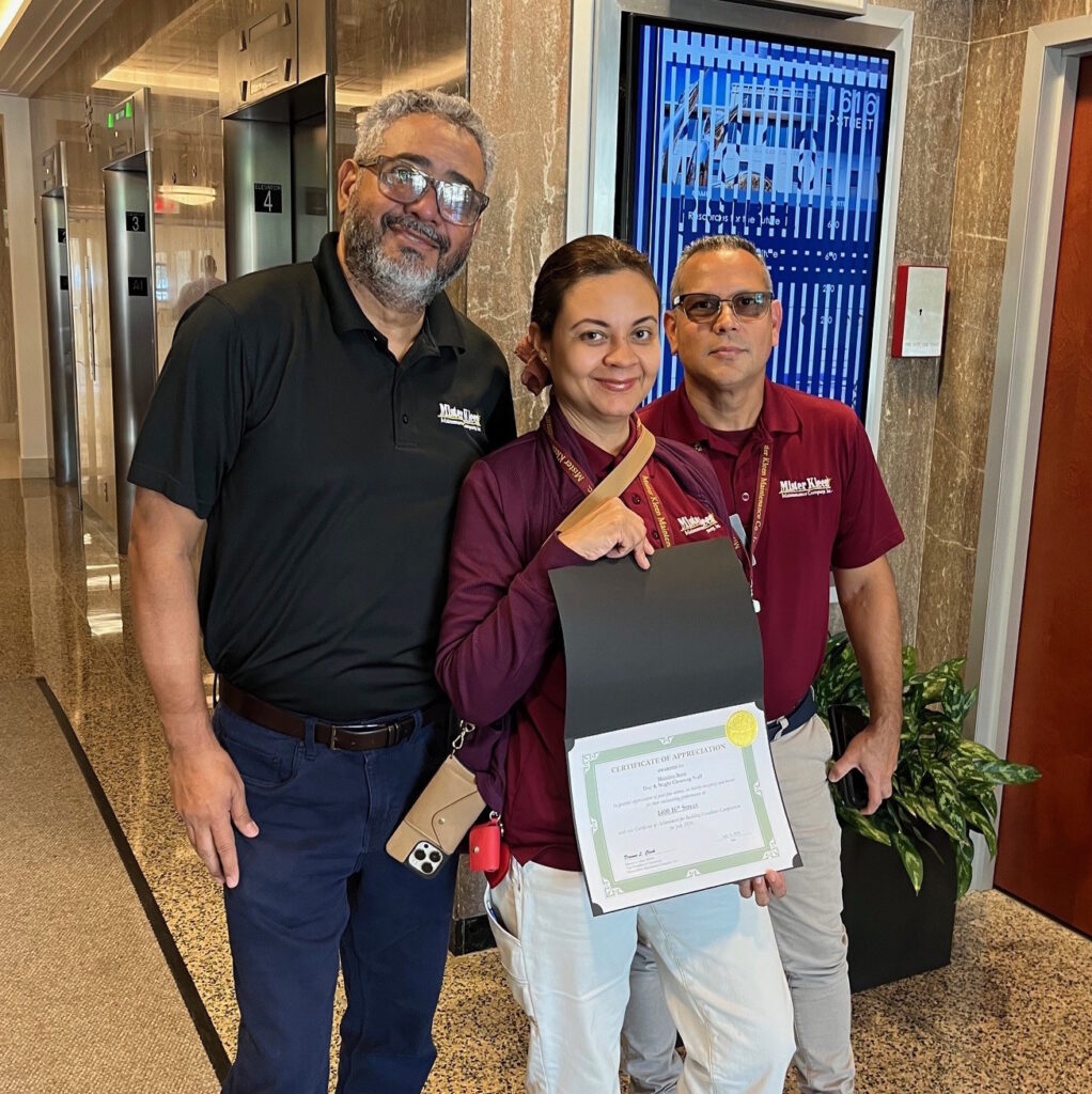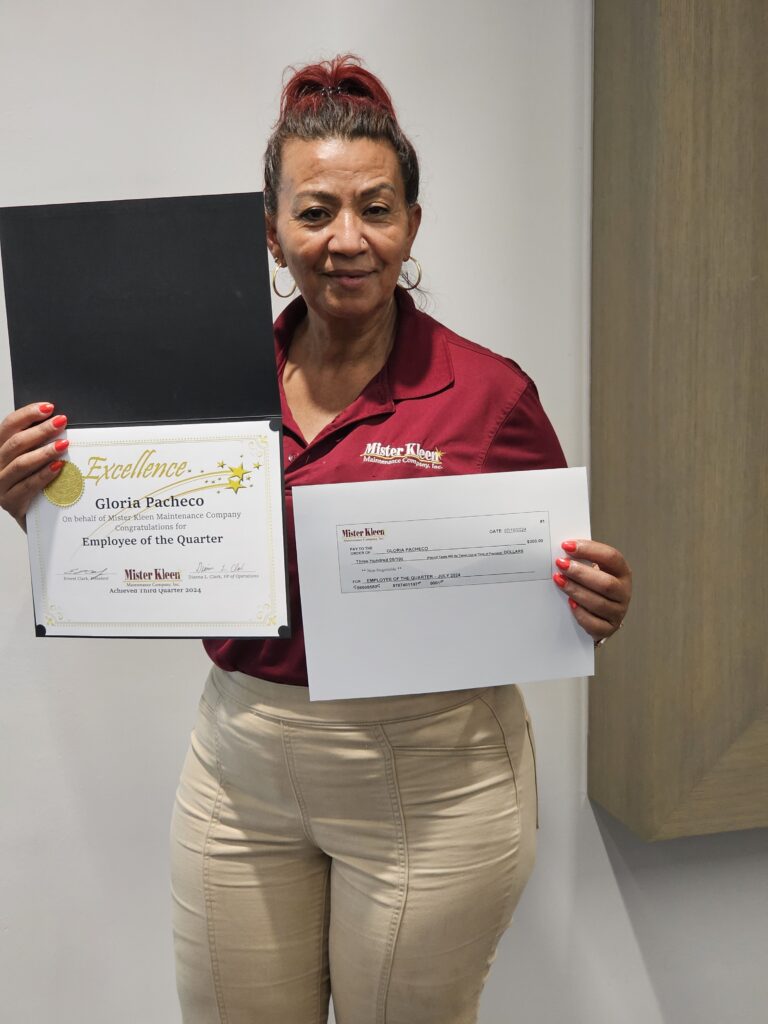 We are thrilled when members of the Mister Kleen Team are recognized for their efforts. Recently a client issued their own certificate for Gladys: “In recognition of your exceptional cleaning work, unwavering dedication, and commitment to making spaces spotless, welcoming, and beautiful. Your attention to detail and hard work go above and beyond, making you the best in the business.” Congratulations Gladys!